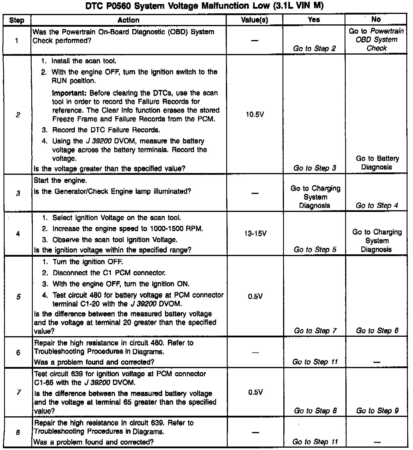 2. The battery voltage must be above 10.5 volts before proceeding with this table.