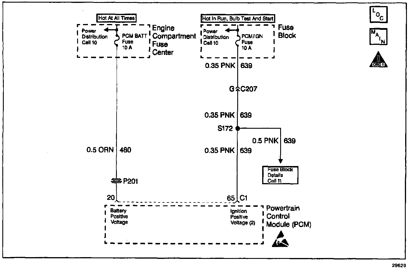 Circuit 480 is the fused battery feed for the Powertrain Control Module (PCM). Circuit 639 is the ignition feed for the PCM.