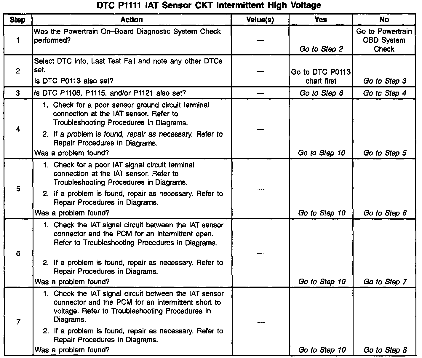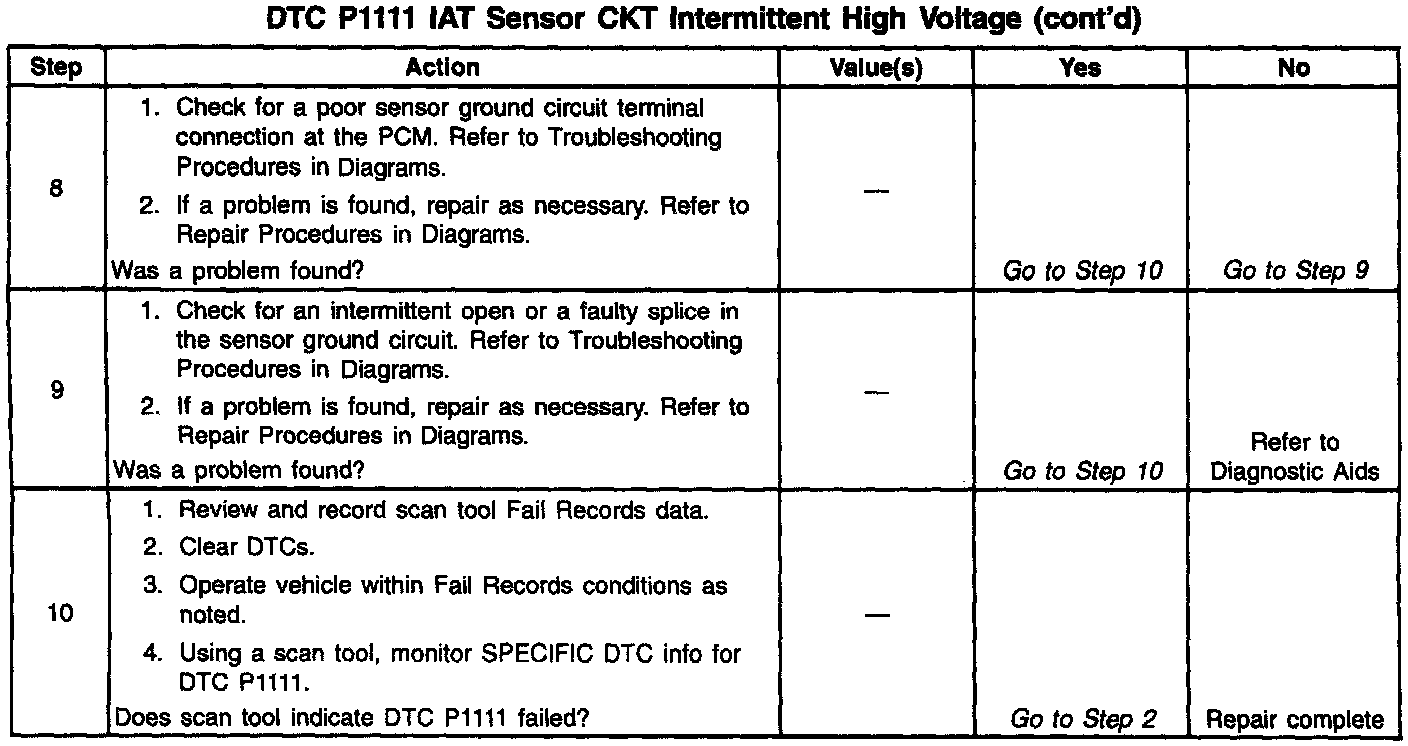The Intake Air Temperature (IAT) sensor is a thermistor which measures the temperature of the air entering the engine. The PCM applies 5 volts through a pull-up resistor to the IAT sensor. When the intake air is cold, the sensor resistance is high and the PCM will monitor a high signal voltage on the IAT signal circuit. If the intake air is warm, the sensor resistance is lower causing the PCM to monitor a lower voltage. DTC P1111 will set when the PCM detects an intermittently high signal voltage on the intake air temperature sensor signal circuit.