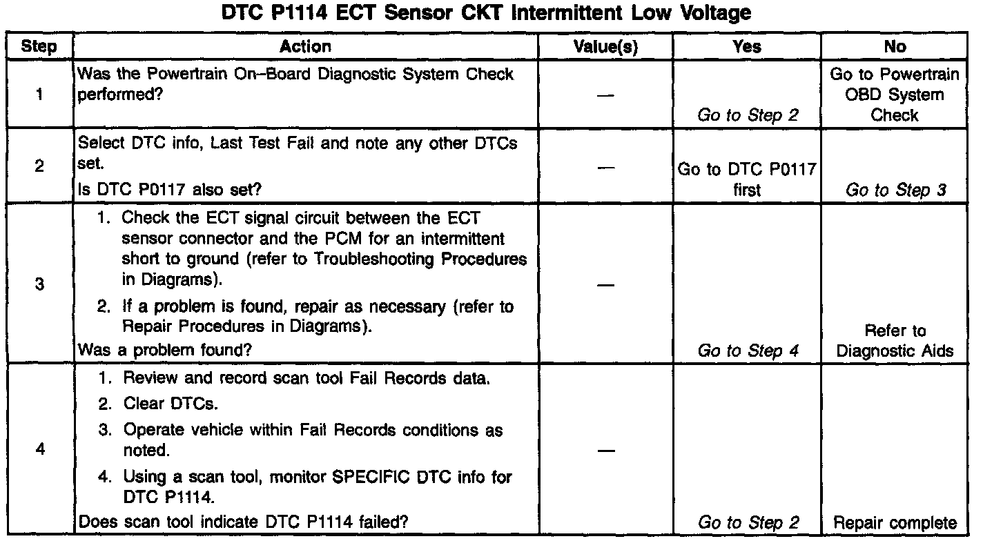 The Engine Coolant Temperature (ECT) sensor is a thermistor mounted in the engine coolant stream. The PCM applies a voltage (about 5.0 volts) through a pull up resistor to the ECT signal circuit. When the engine coolant is cold, the sensor (thermistor) resistance is high therefore the PCM will measure a high signal voltage. As the engine coolant warms, the sensor resistance becomes less, and the ECT signal voltage measured at the PCM drops. With a fully warmed up engine, the ECT signal voltage should measure about 1.5 to 2.0 volts. If the PCM detects an ECT signal that is intermittently below the range of the ECT sensor, DTC P1114 will set.