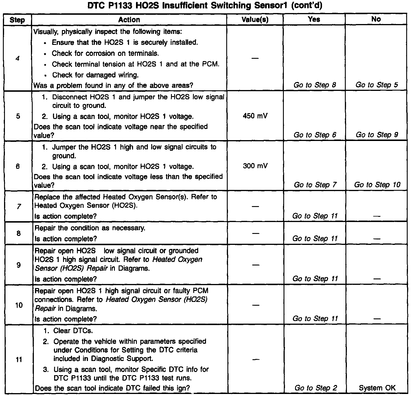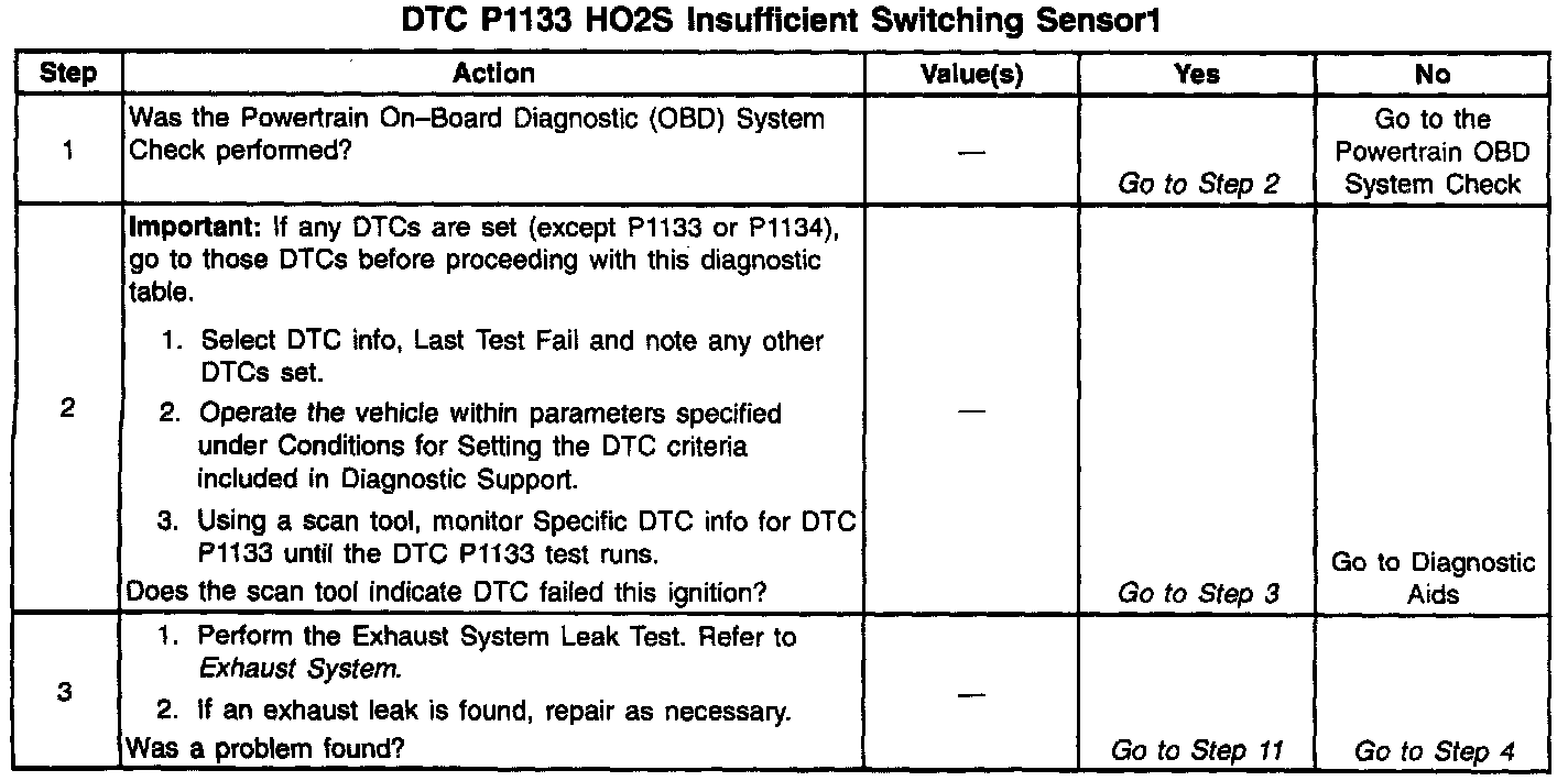A malfunction in the HO2S heater ignition feed or ground circuit may cause a DTC P1133 to set. Check HO2S heater circuitry for intermittent faults or poor connections. If connections and wiring are OK and DTC P1133 continues to set, replace the HO2S 1.