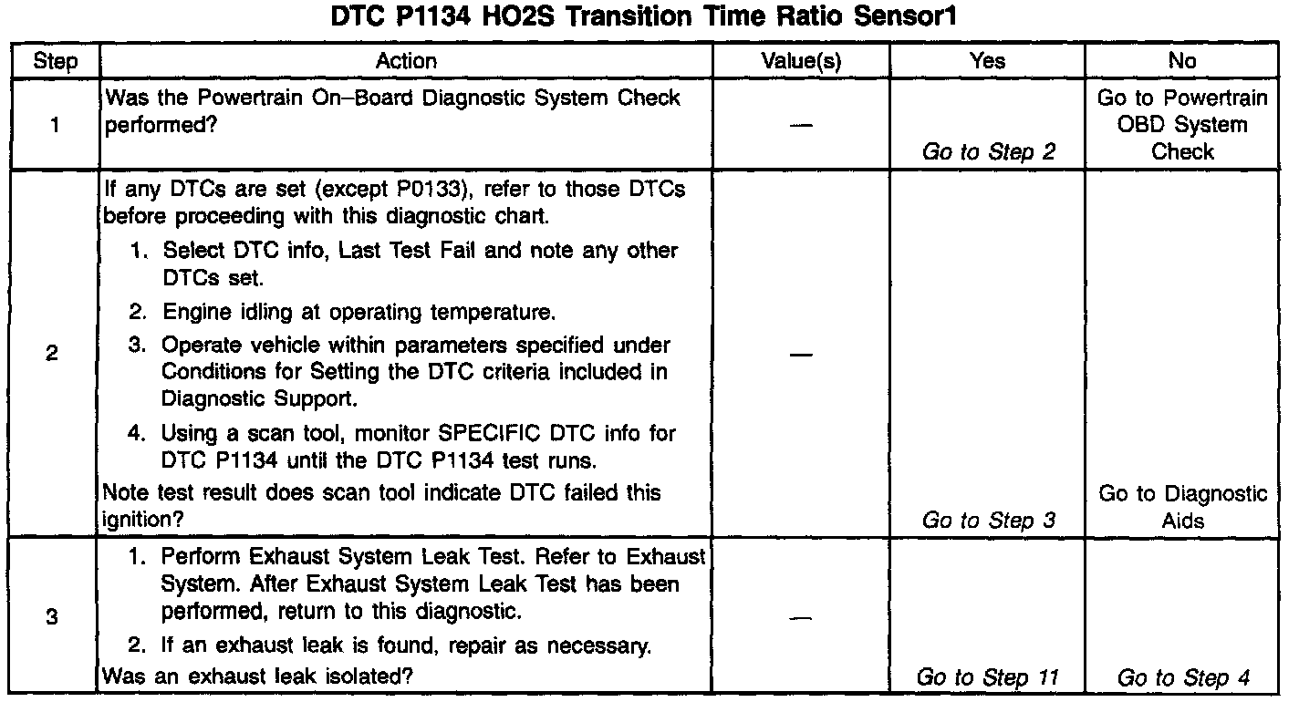 The PCM continuously monitors the Heated Oxygen Sensor (HO2S) activity for 100 seconds. During the monitor period the PCM counts the number of times that the HO2S responds from rich to lean and from lean to rich and adds the amount of time it took to complete all transitions. With this information, an average time for all transitions can be determined. The PCM then divides the rich to lean average by the lean to rich average to obtain a ratio. If the HO2S transition time ratio is not within range, DTC P1134 will be set, indicating that the oxygen sensor is not responding as expected to changes in exhaust oxygen content