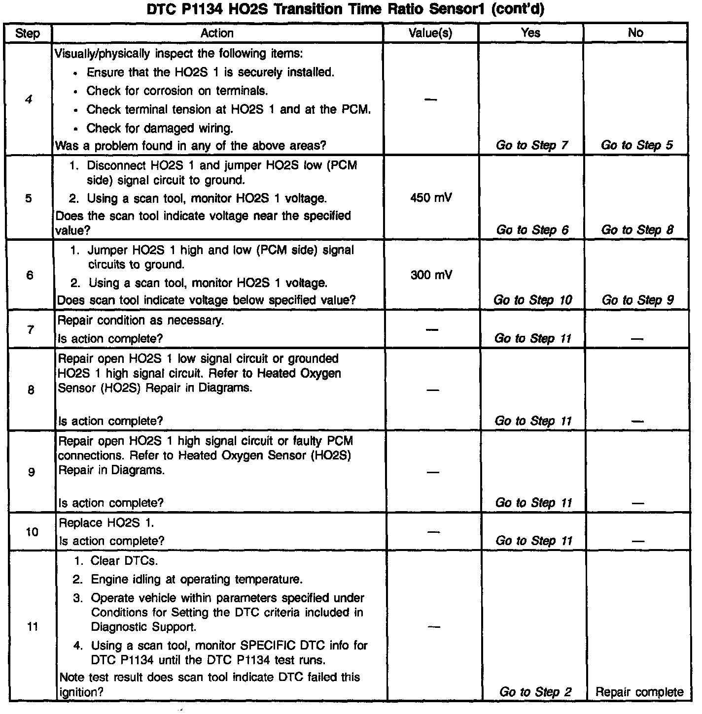 A malfunction in the HO2S heater ignition feed or ground circuit may cause a DTC P1134 to set. Check HO2S heater circuitry for intermittent faults or poor connections. If connections and wiring are OK and DTC P1134 continues to set, replace the HO2S 1.