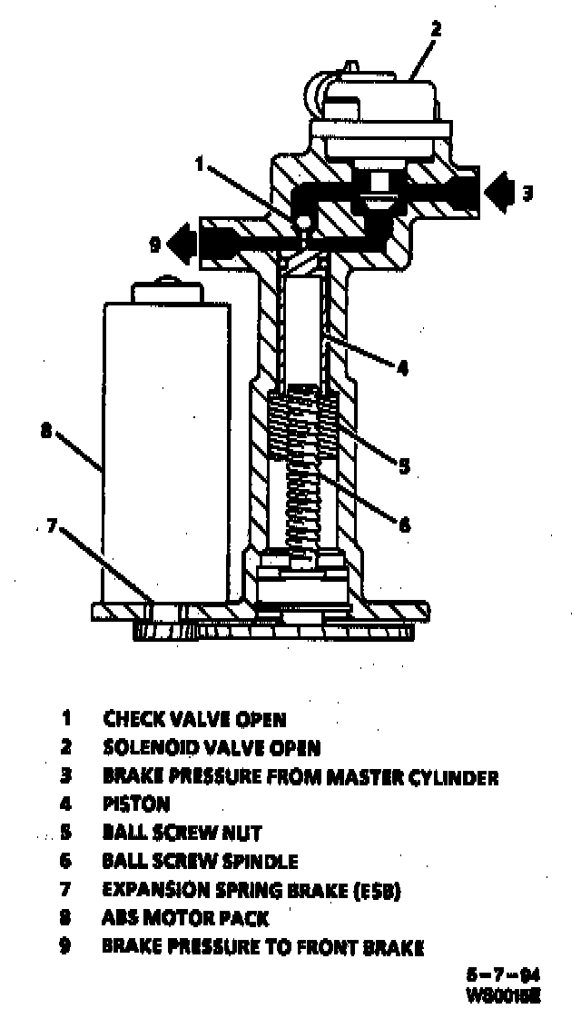 Under normal operating conditions, the brake system will operate using conventional braking by means of brake pedal force, the vacuum booster, and the master cylinder. Each front channel consists of a motor with an Expansion Spring Brake (ESB), gear driven ballscrew, piston, check valve and solenoid. Under normal operating conditions (base brakes), the piston is held in the upmost (or "home") position. This is accomplished by turning the screw via the motor to drive the nut upwards. Once at the upmost (or "home") position, the piston is held by an ESB. While at the upmost position, the piston also unseats the check valve via a protrusion on the piston. Two paths are then available to transfer braking pressure to the wheel: (1) through the modulator, around the check valve, and out to the wheel, (2) through the modulator, past the normally open solenoid, and out to the wheel.