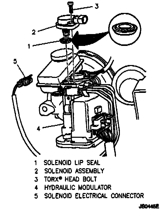 1. New solenoid. Verify that the solenoid lip seal is properly positioned before solenoid is installed in hydraulic modulator. Position solenoid so that its electrical connector will face the same direction as the solenoid that was removed. By hand, press down firmly on solenoid until its flange seats on ABS hydraulic modulator.