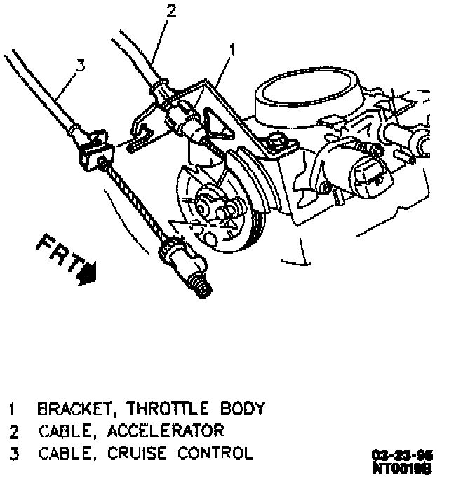 1. Cruise control cable tab from TBI cam. Rotate throttle body cam to 1/4 open throttle to release tab.