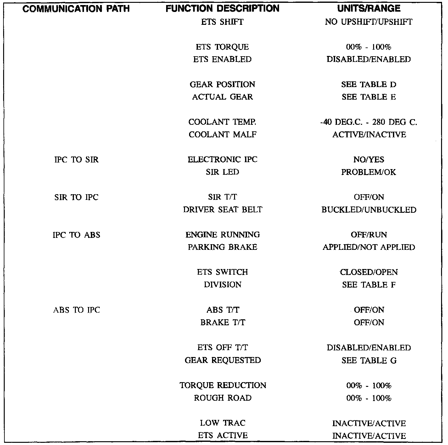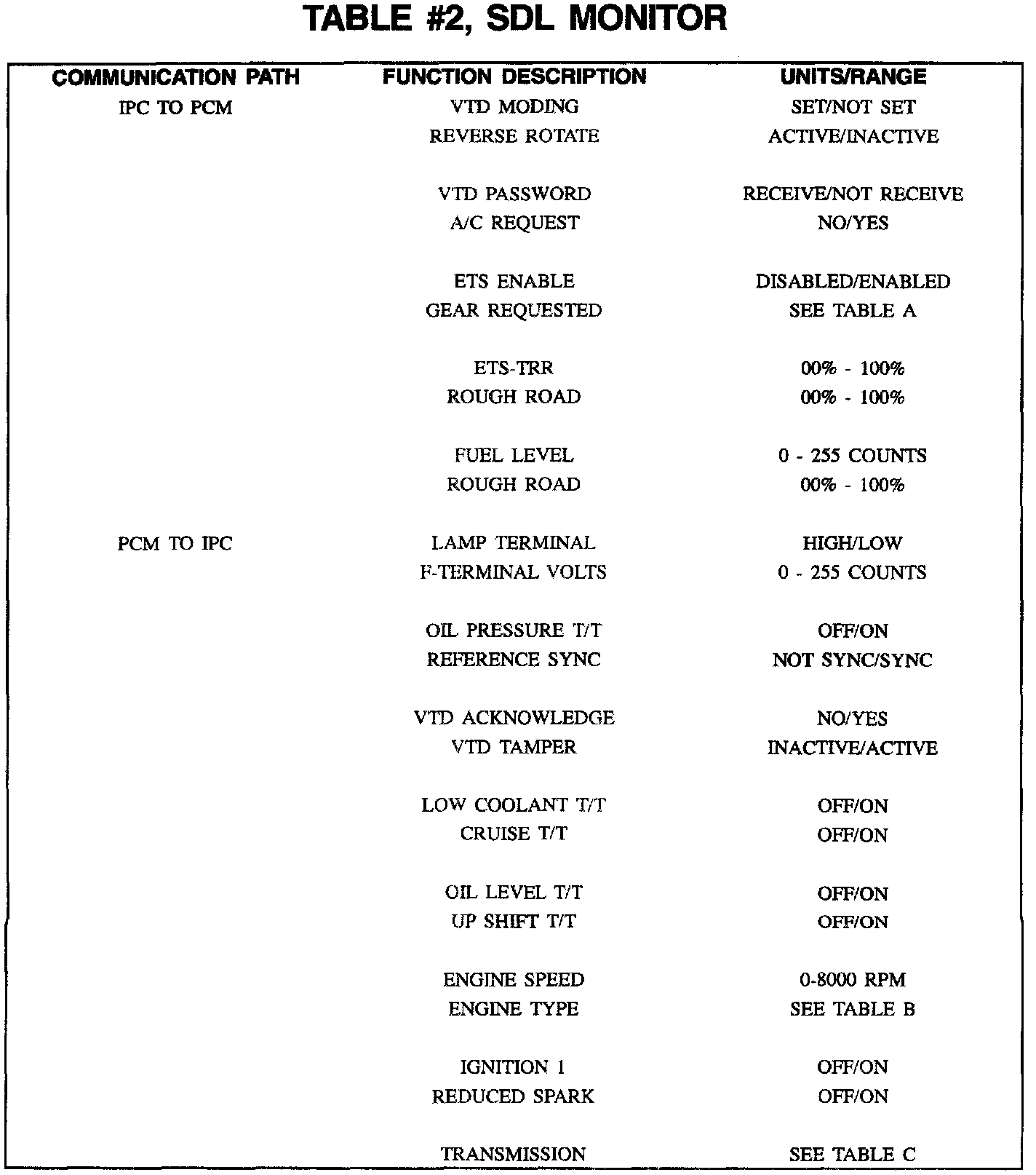 The TECH 2 Scan Tool can be used to monitor the communications between controllers to diagnose problems in the vehicle. This is called the "SDL (Serial Data Link) MONITOR" on the TECH 2. Refer to Table #2 for listing of normal communications between the IPC and various control modules. Please note that this table includes all options and some may not be active on all cars. The term ABS refers to the Anti-lock Brake System which is controlled by the EBCM. The term SIR refers to Supplemental Inflatable Restraint which is controlled by the SDM. This table is broken into display pairs as the TECH 2 Scan Tool lists two function descriptions per screen.