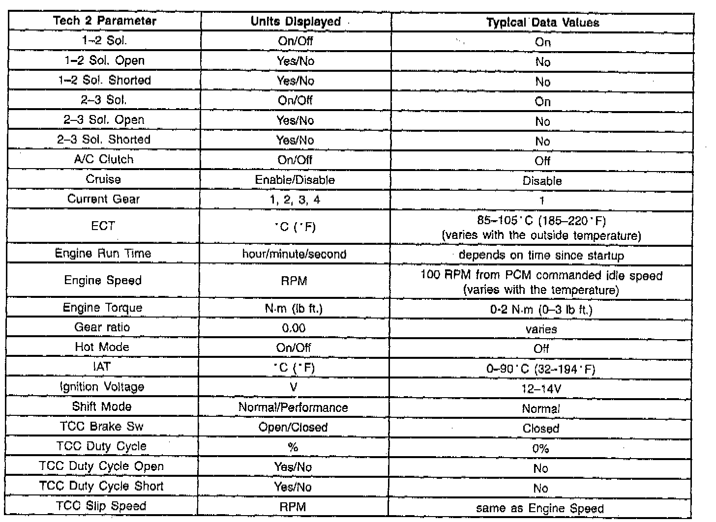 If you have completed the On-Board Diagnostic (OBD) system check, if the diagnostics are functioning properly and if no DTCs display, you may use the Typical Scan Values in the table below for comparison within the appropriate transmission. These typical values are an average of display values recorded from normally operating vehicles. They represent the display from a normally functioning system.