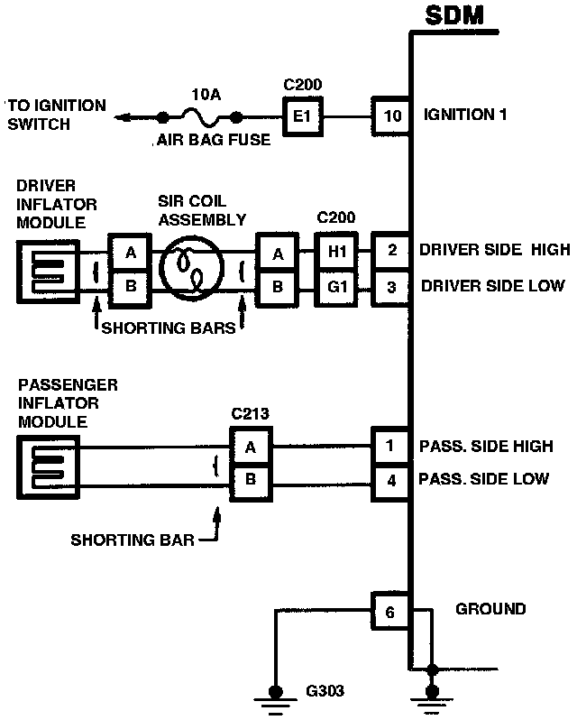 The inflatable restraint Sensing and Diagnostic Module (SDM), inflatable restraint steering wheel module coil (SIR coil assembly), inflatable restraint steering wheel module (driver inflator module), inflatable restraint I/P module (passenger inflator module) and connector wires make up the deployment loops. The function of the deployment loops is to supply current through the inflator modules, which will cause deployment of the air bags. Deployment occurs when the inflatable restraint Sensing and Diagnostic Module (SDM) detects vehicle velocity changes severe enough to warrant deployment.
