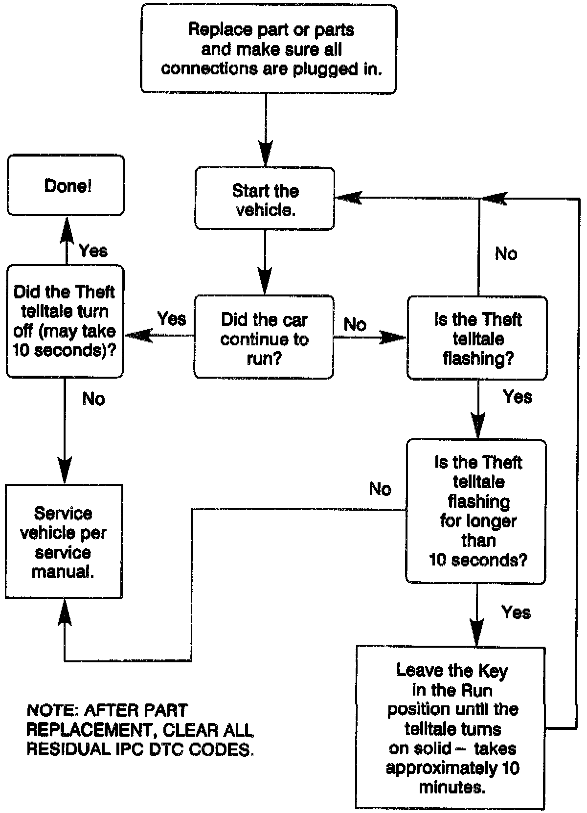 If any of these parts are replaced, the vehicle may start and stall for 10 minutes (LONG TAMPER MODE). If this occurs, the system MUST go through a LONG TAMPER MODE cycle. During this time, the THEFT TELLTALE will be flashing for the full ten minutes. The IPC and PCM require the full 10 minutes to complete a learn cycle. The Ignition Key MUST remain in the "RUN" position until the telltale stops flashing or the cycle will have to be repeated.