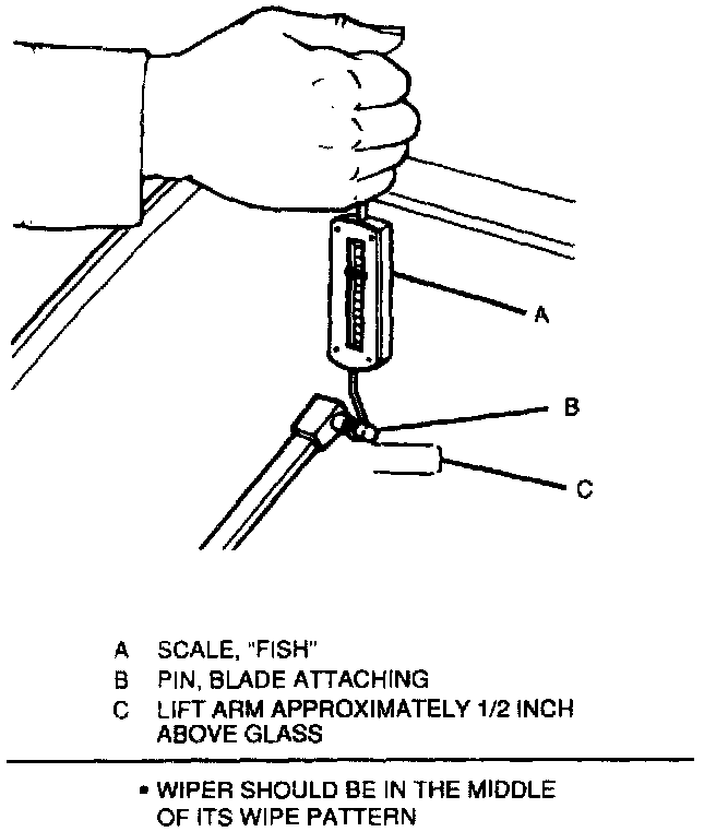 3. Attach a scale to wiper arm attaching pin and measure the force required to lift wiper arm perpendicular to windshield to normal working height (height with blade assembly attached).