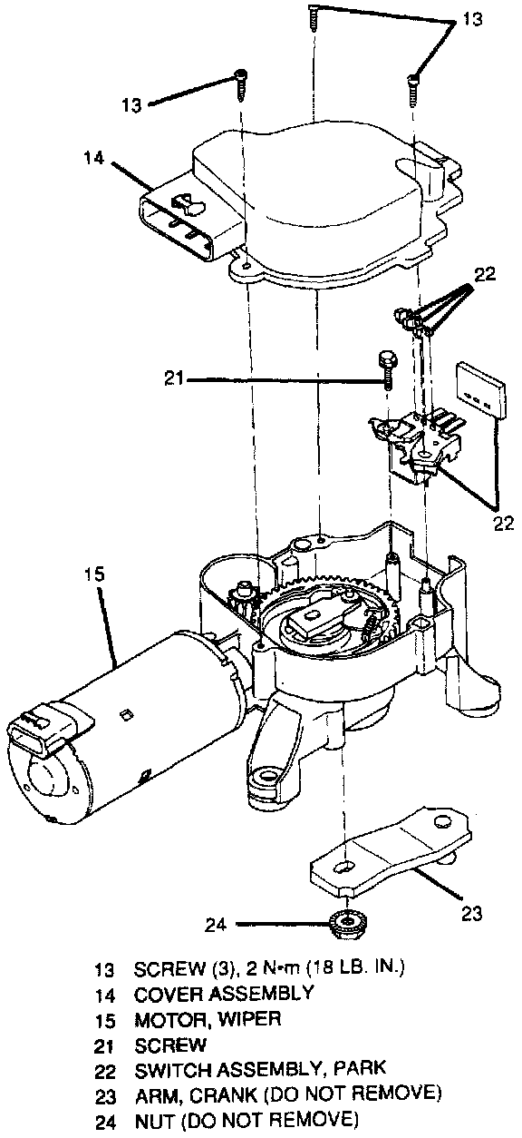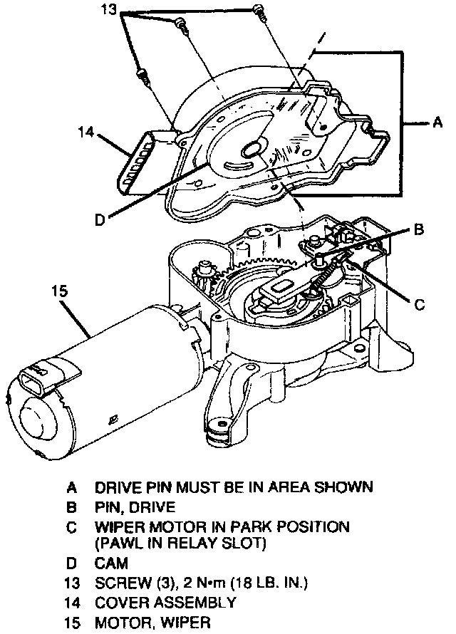 3. Wiper motor cover assembly (14). Follow "Wiper Motor Cover Assembly Replacement" procedure carefully.