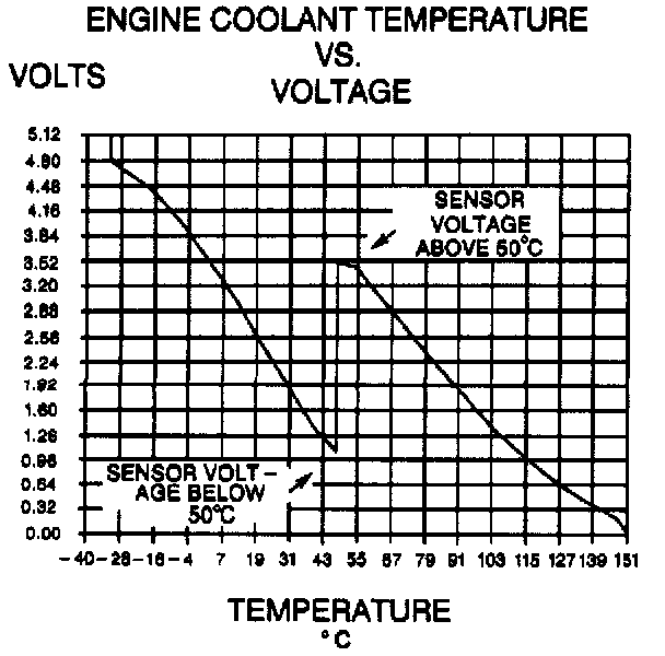The PCM supplies a 5 volt signal to the engine coolant temperature sensor through a resistor in the PCM and measures the voltage. The voltage will be high when the engine is cold, and low when the engine is hot. By measuring the voltage, the PCM calculates the engine coolant temperature. The scan tool displays engine coolant temperature in degrees. After engine startup, the temperature should rise steadily to about 90°C (194°F) then stabilize when thermostat opens. If the engine has not been run for several hours (overnight), the engine coolant temperature and intake air temperature displays should be close to each other.