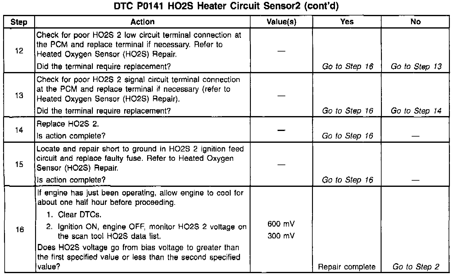 The PCM will run the heater test only after a cold start (determined by engine coolant and intake air temperature at the time of start-up) and only once during an ignition cycle. When the engine is started the PCM will monitor the HO2S voltage. When the Bank HO2S voltage indicates a sufficiently active sensor, the PCM looks at how much time has elapsed since start-up. If the PCM determines that too much time was required for the HO2S 2 to become active, a DTC P0141 will set. The time it should take the HO2S to reach operating temperature is based on the engine coolant temperature at start-up and the average Mass Air Flow since start-up (higher average airflow or higher start-up engine coolant temperature = shorter time to HO2S activity).