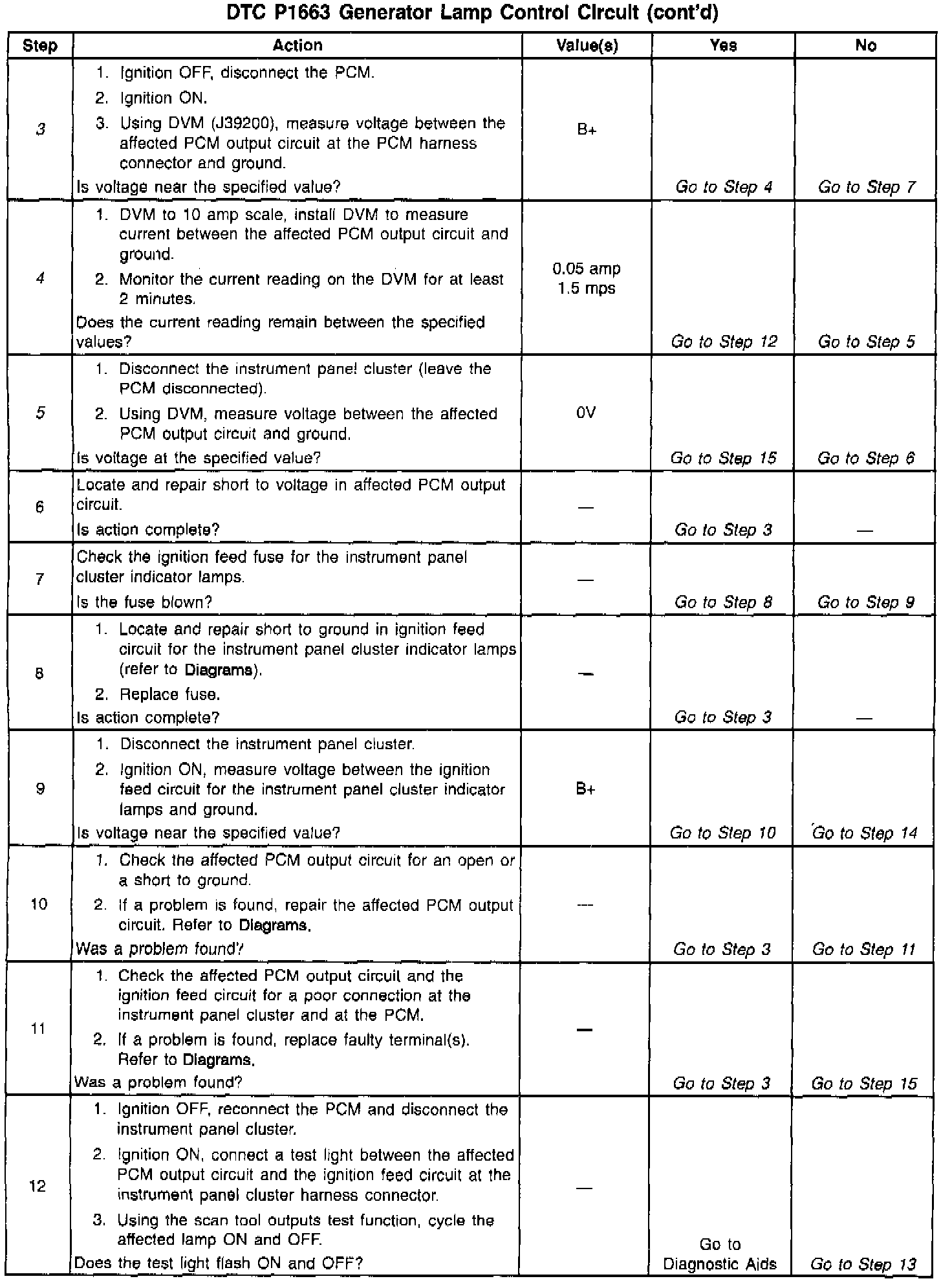 4. Checks for a shorted component or a short to B+ on the output driver circuit. Either condition would result in a measured current of over 1.5 amps. Also checks for a component that is going open while being operated, resulting in a measured current of 0 amps.