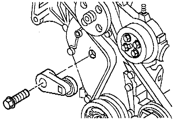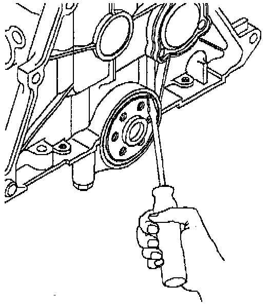 ^ Install a large screwdriver carefully in the camshaft bolt hole.