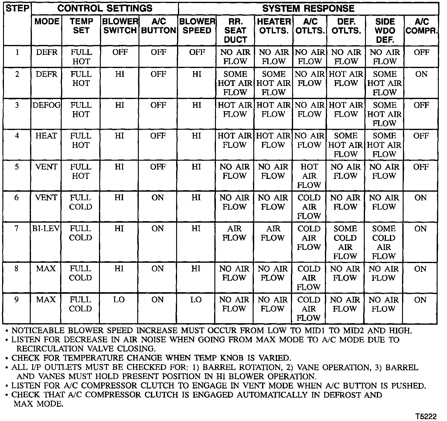 1. Operation of the air conditioning blower at all four speeds with the (mode) in any position except "OFF" and engagement of the compressor clutch would indicate that the electrical circuits are functioning properly. (The blower will not operate in any speed with the mode button in the "OFF" position.)