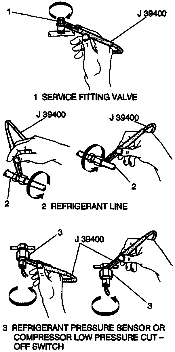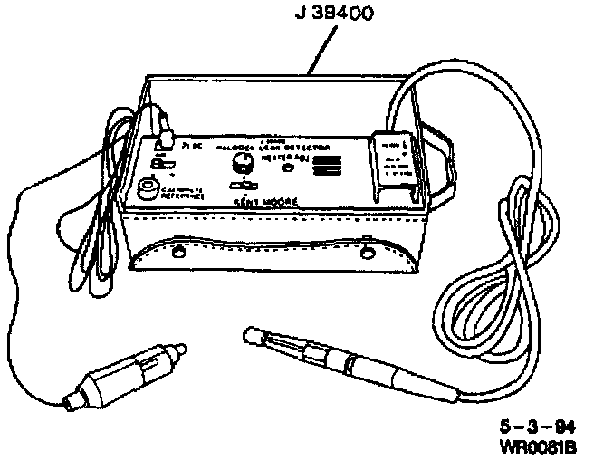 This type of leak detector has been found to be the most useful tool in locating refrigerant leaks. J 39400 is a small unit which operates on 12V DC and provides an audible signal which increases in frequency as R-12 or R-134a is detected. There are three settings: one for R-12, one for R-134a, and gross. The gross leak setting is for isolating very large leaks already found in one of the other two settings. Care must be taken that the instrument is properly calibrated, per the included instructions, and that the detector is used in the proper setting for the type of refrigerant system being tested. Prior to beginning the test, make sure the refrigerant system is sufficiently charged for leak testing by measuring the static pressure with a gage set. Readings in the range 413 to 689 kpa (60 to 100 psi) are acceptable to conduct a leak test.