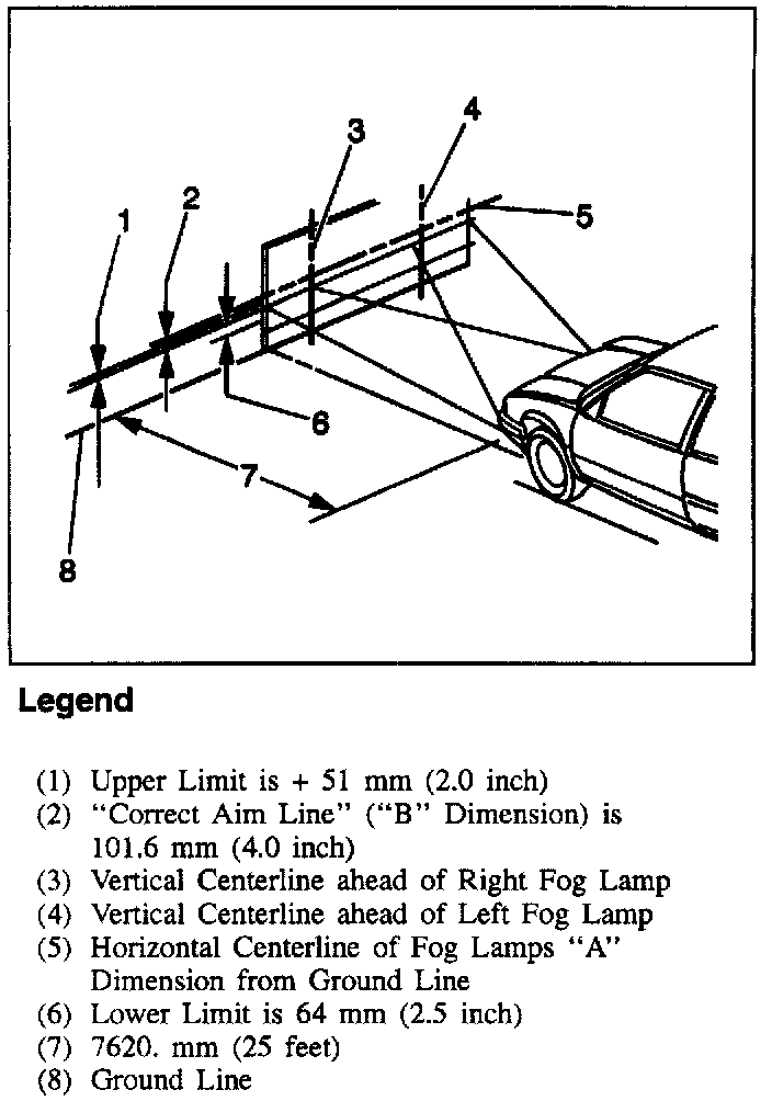 3. Turn fog lamps on, the top of the fog lamp beam image on the target screen should be ("B" Dimension) 101.6 mm (4.0 inch.) below center of fog lamp lens height.