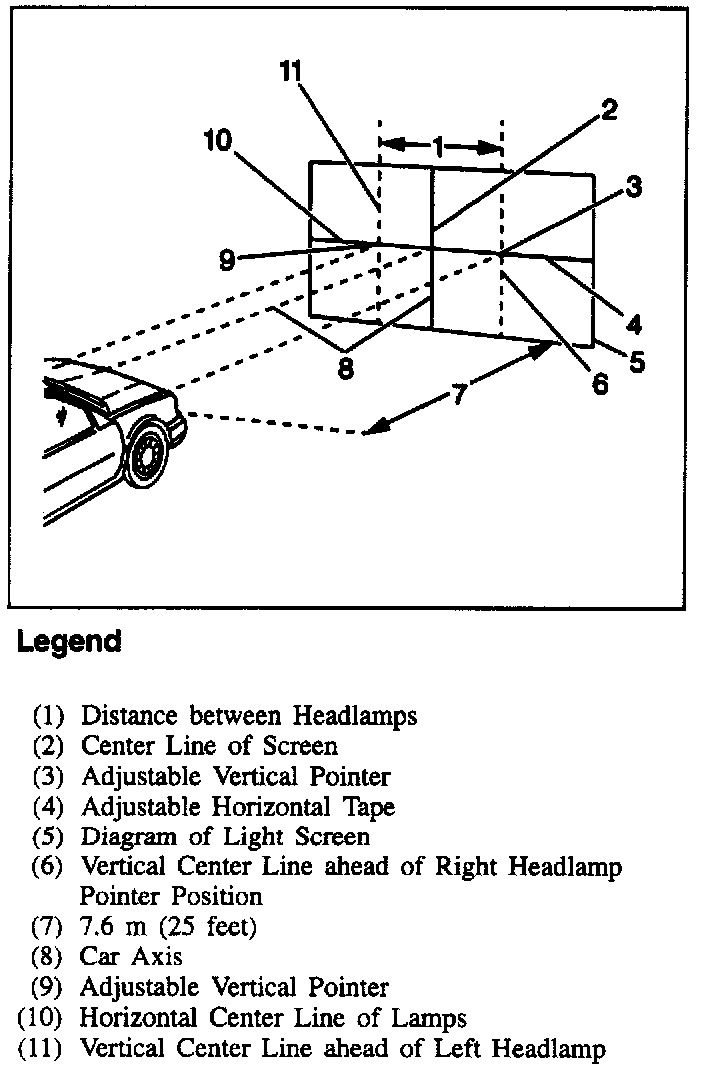 The screen should be 1.5 m (5 feet) high x 3.6 m (12 feet) wide with a matte white surface well-shaded from extraneous light, and properly adjusted to the floor on which the vehicle stands. Provisions may be made for moving the screen so it can be aligned parallel with the rear axle and a horizontal line drawn perpendicularly from the centerline of the screen will pass an equal distance midway between the two headlamps.