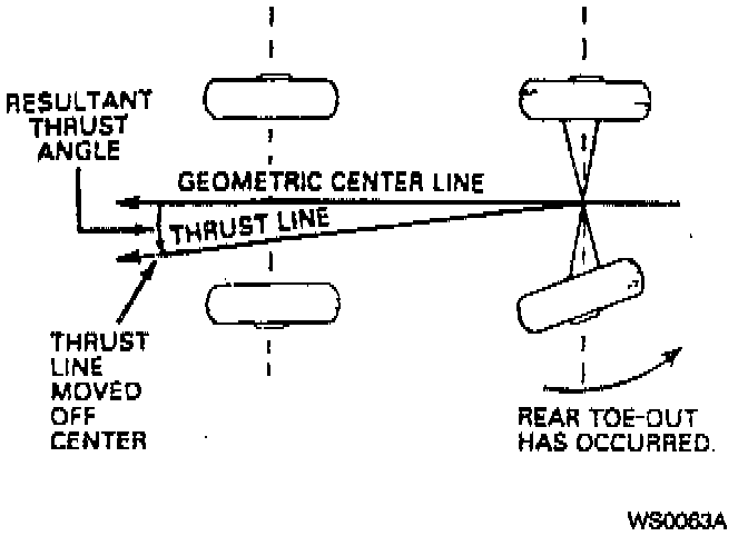 The front wheels aim or steer the vehicle, but the rear wheels control tracking. This tracking action is related to thrust angle. Thrust angle is defined as the path that the rear wheels will take. Ideally, the thrust angle would be geometrically aligned with the body centerline.