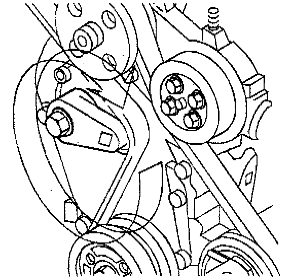 1. Install the belt under the tensioner pulley by lifting or rotating the drive belt tensioner, using a 3/8 in breaker bar.