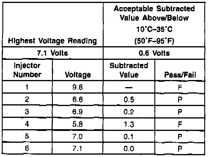 3. The first second of the voltage displayed by the DVM may be inaccurate due to the initial current surge, therefore, record the lowest voltage displayed by the DVM after the first second of the test. The voltage displayed by the DVM may increase throughout the test as the fuel injector windings warm and the resistance of the fuel injector windings changes. An erratic voltage reading (large fluctuations in voltage that do not stabilize) indicates an intermittent connection within the fuel injector. From the voltages recorded, identify the highest voltage, excluding any voltages above 9.5 volts. Subtract each voltage that is not above 9.5 volts from the highest voltage. Record each subtracted value (refer to the Example). The subtracted value for any fuel injector must not exceed 0.6 volt. A fuel injector with a subtracted value that is greater than 0.7 volt is considered faulty and must be replaced. A fuel injector with a recorded voltage above 9.5 volts is also considered faulty and must be replaced.