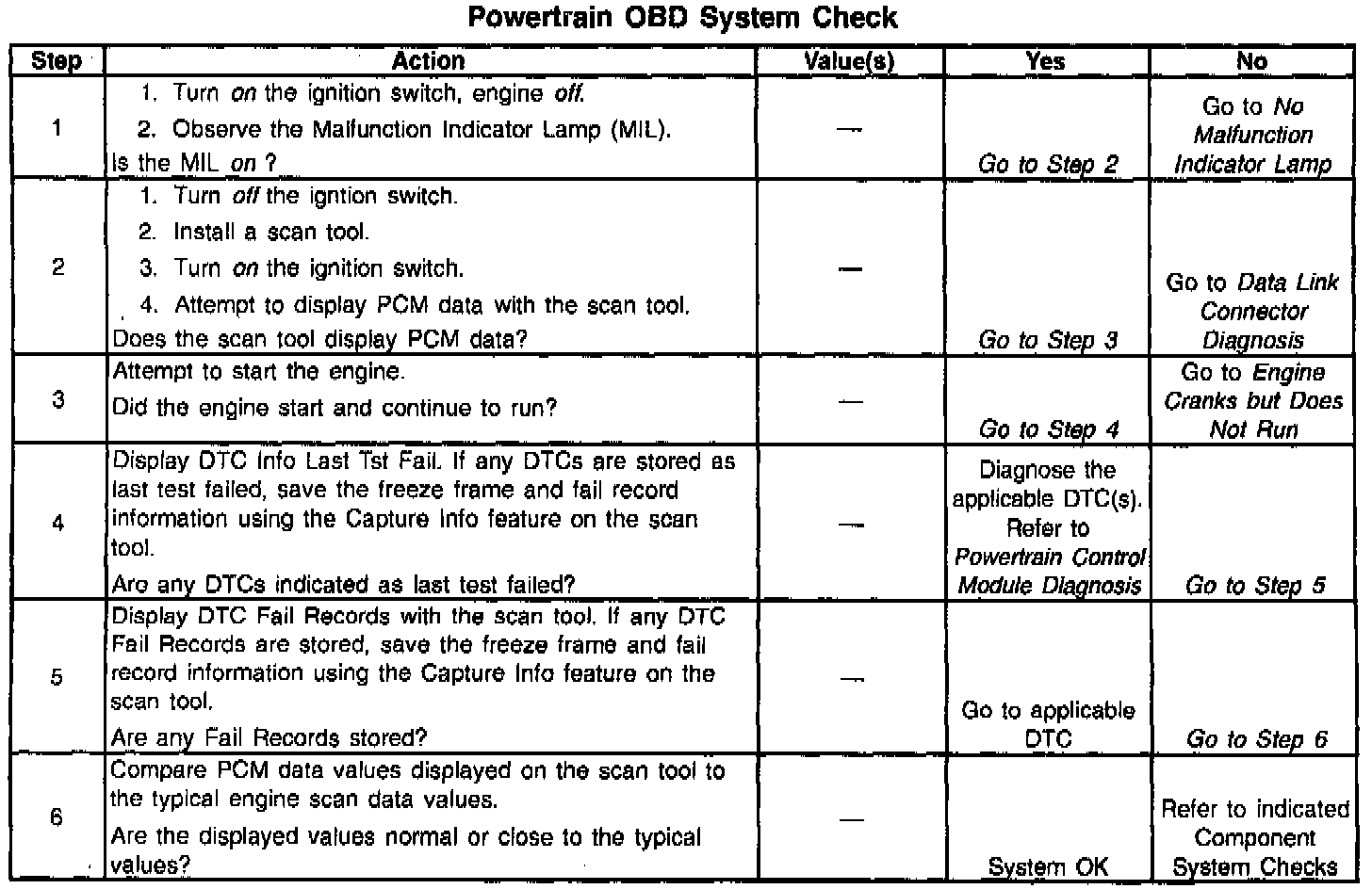 The Powertrain OBD system check is an organized approach to identifying a problem created by an electronic engine control system malfunction. The Powertrain OBD system check must be the starting point for any driveability complaint diagnosis. The Powertrain OBD system check directs the service technician to the next logical step in diagnosing a complaint. Do not perform this check if no driveability complaint exists. Understanding the table and using it correctly will reduce diagnostic time and prevent the replacement of good parts.