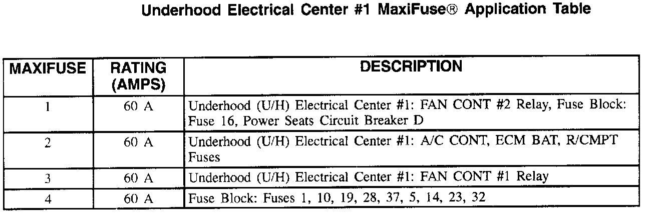 Underhood Electrical Center #1 Maxifuse Application Table: