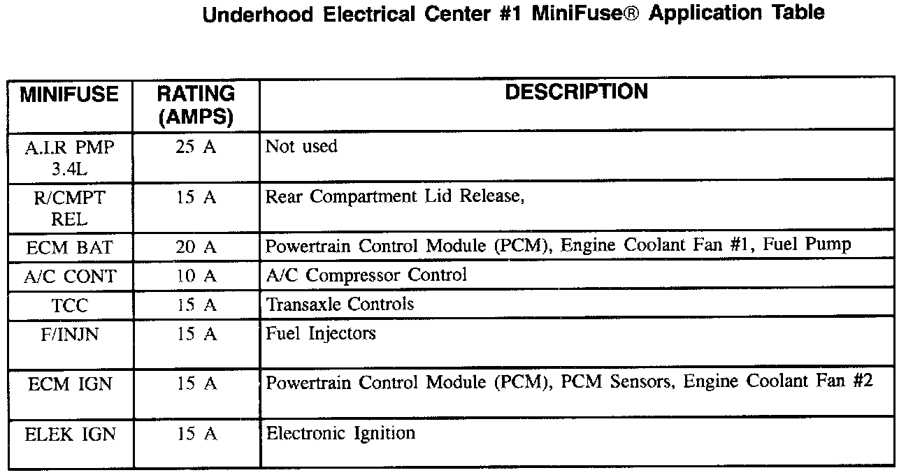 Underhood Electrical Center #1 Minifuse Application Table:
