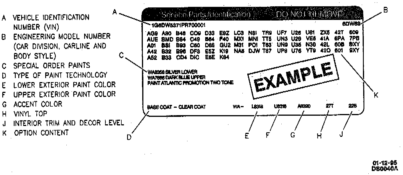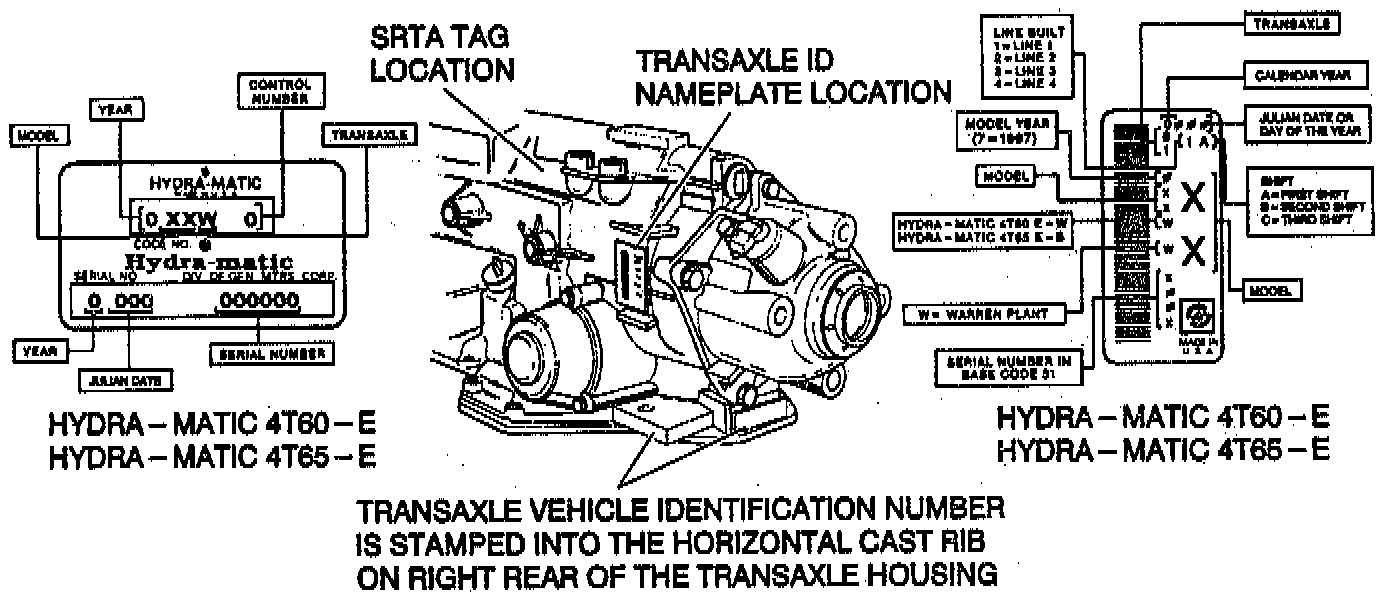 All automatic transaxles have a metal identification nameplate attached to the case exterior. The location of this nameplate is shown. The information on the nameplate will assist in the servicing and determination of replacement parts when ordered through a manufacturer's parts catalog. Additional transaxle identification is provided on the Service Parts Identification Label. This label contains information on the Regular Production Options (RPO) as well as standard and mandatory options, as shown.