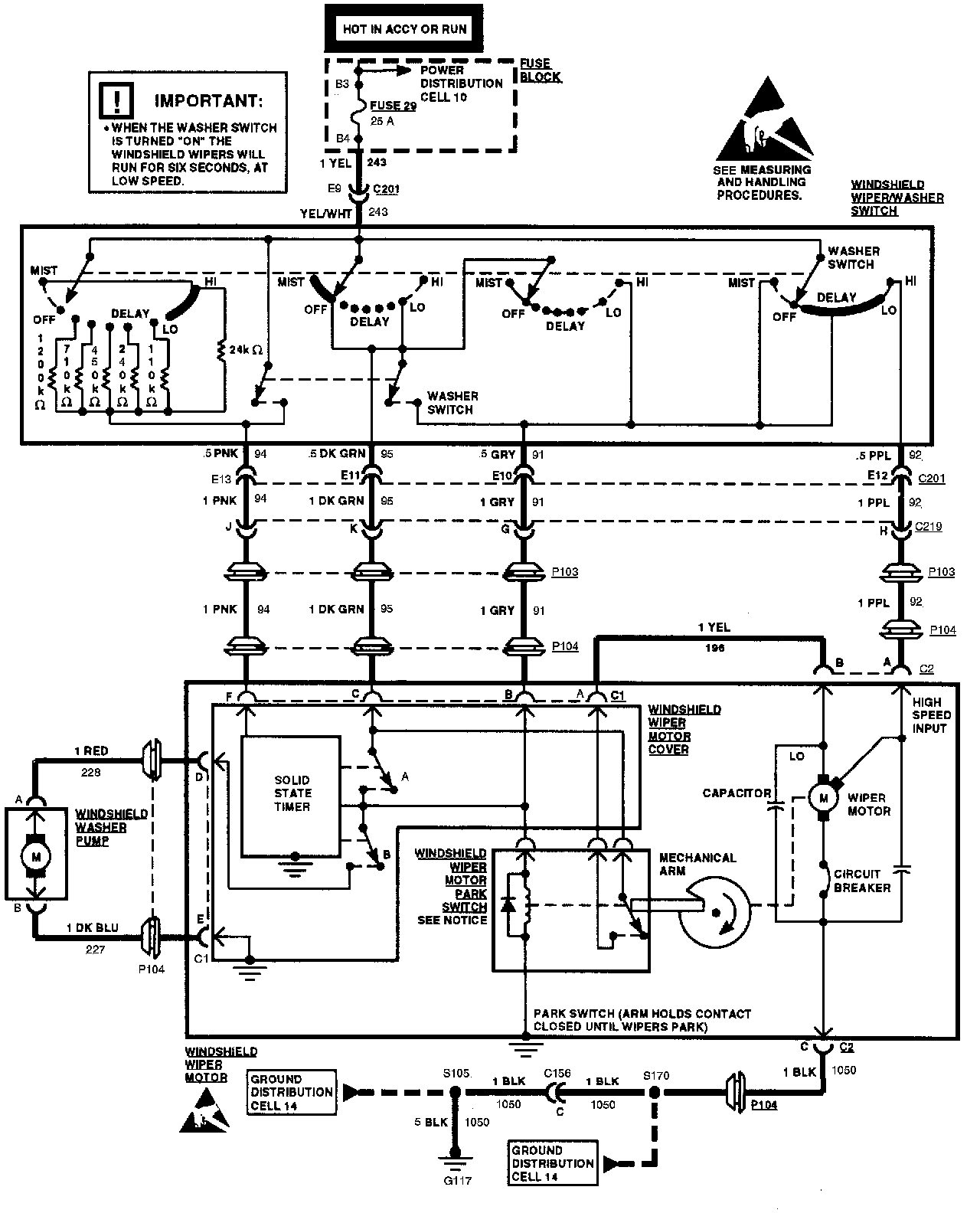 In addition to the features of a conventional (non-pulse) wiper system (low and high speeds), the pulse-type windshield wiper/washer system includes an operating mode in which the wipers make single sweeps with an adjustable time interval between sweeps. The time interval is controlled by a solid-state timer in the wiper motor assembly. The duration of the delay interval is determined by the delay rheostat in the wiper/washer switch assembly.