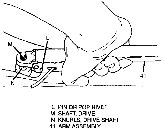 2. Wiper arm assembly (41) on transmission drive shaft (M), then remove pivot pin or pop rivet (L).