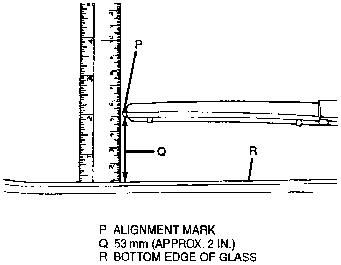 ^ If installing LH wiper arm and blade assembly, the blade tip must be 53 mm (approx. 2 in.) from bottom edge of glass.