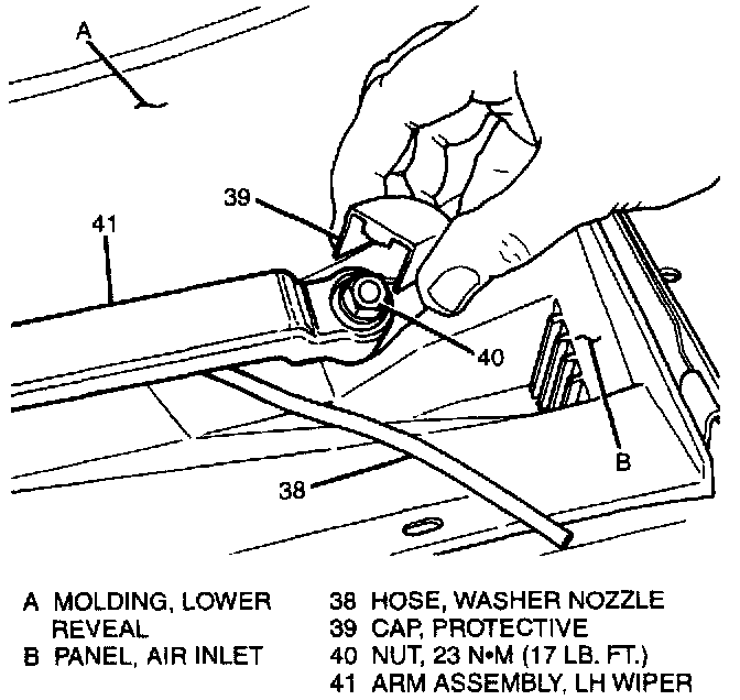 1. Washer nozzle hose (38), protective cap (39) and nut (40) from wiper arm assembly (41) with wipers in park position and hood raised.