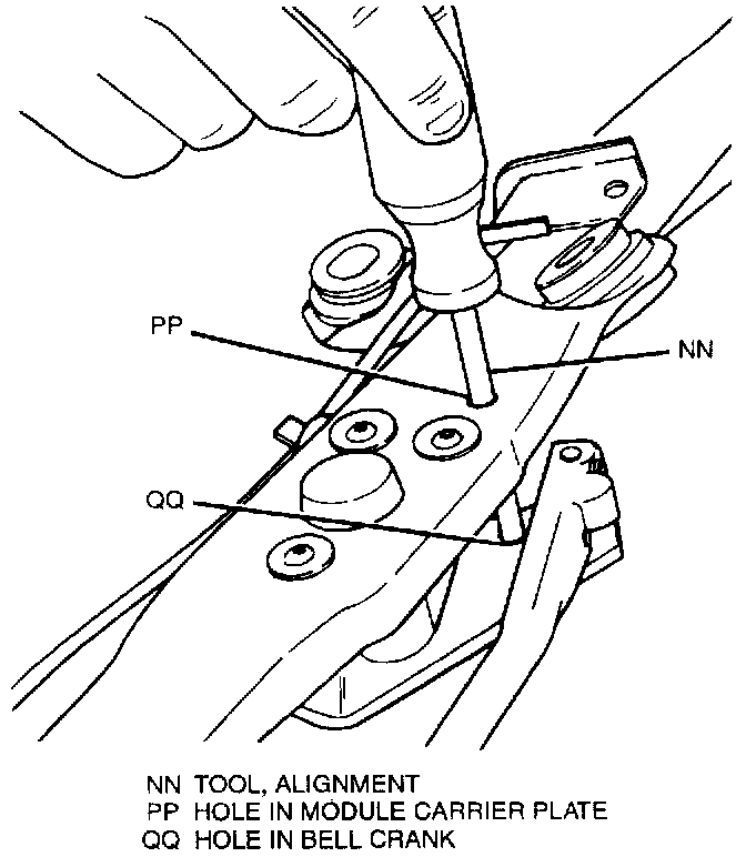 2. Using a bolt or other suitable diameter tool (Phillips screwdriver), line up holes in module carrier plate and bell crank together.