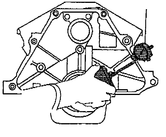 8. Inspect the oil pan rail and timing cover attaching area for nicks. Minor irregularities may be cleaned up with a flat mill file.