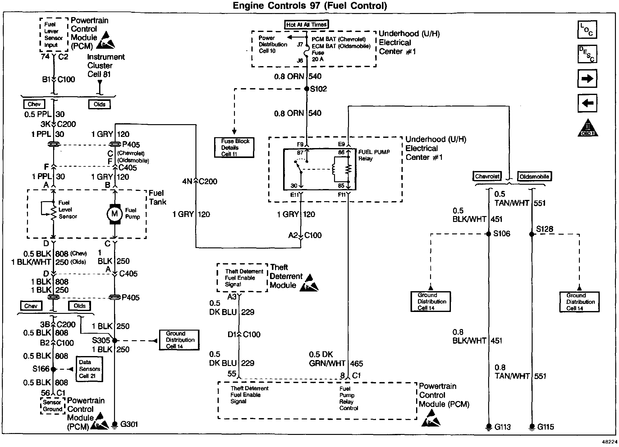 The fuel pump delivers fuel to the fuel rail and injectors, then to the fuel pressure regulator. The fuel pressure regulator, a vacuum sensitive device, controls fuel pressure by allowing excess fuel to be returned to the fuel tank. With the engine stopped, the fuel pump can be turned ON by using a fused jumper to apply B+ to the fuel pump test lead in the engine compartment.