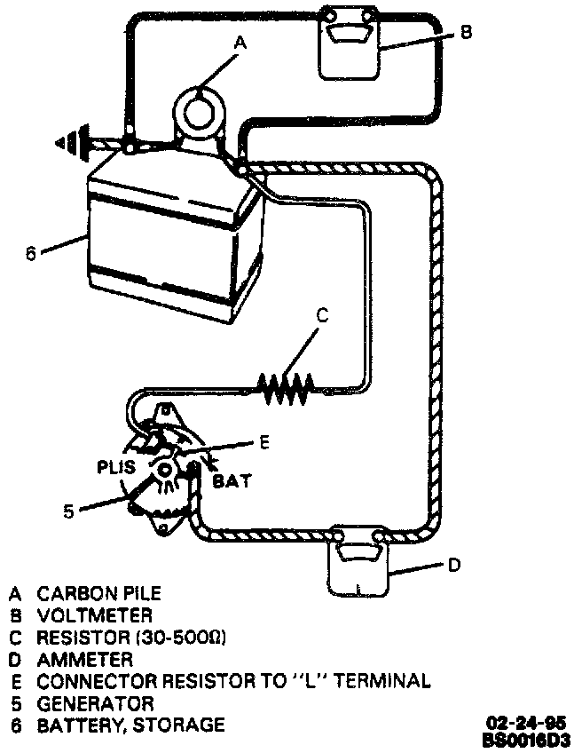 2. Make electrical connections. Be sure the carbon pile is turned off. Ground polarity of generator and battery must be the same. Battery must be fully charged. Use a 50 ohm resistor between battery and "L" terminal of generator.
