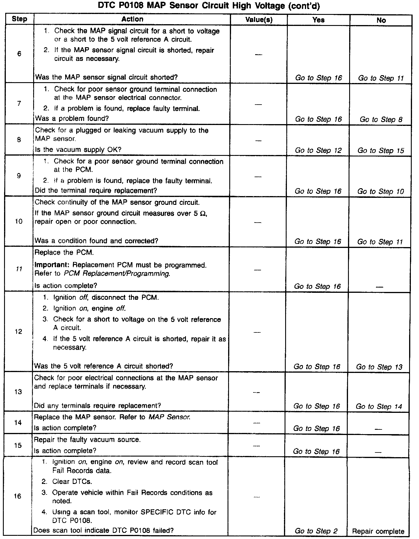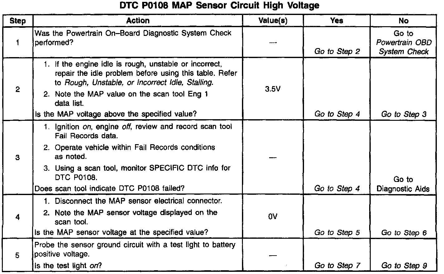 If DTC P0108 cannot be duplicated, the information included in the Fail Records data can be useful in determining since the DTC was last set. If it is determined that the DTC occurs intermittently, performing the DTC P1108 Diagnostic Chart may isolate the cause of the fault.
