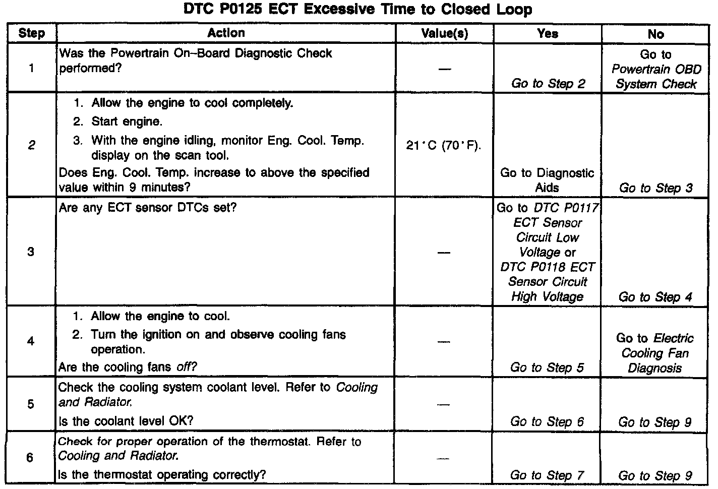 DTC P0125 set indicates a skewed ECT sensor. Comparing the engine coolant temperature displayed on a scan tool with actual coolant temperature measured with a thermometer may isolate this condition. If the displayed engine coolant temperature is not close to the actual coolant temperature, replace the ECT sensor.
