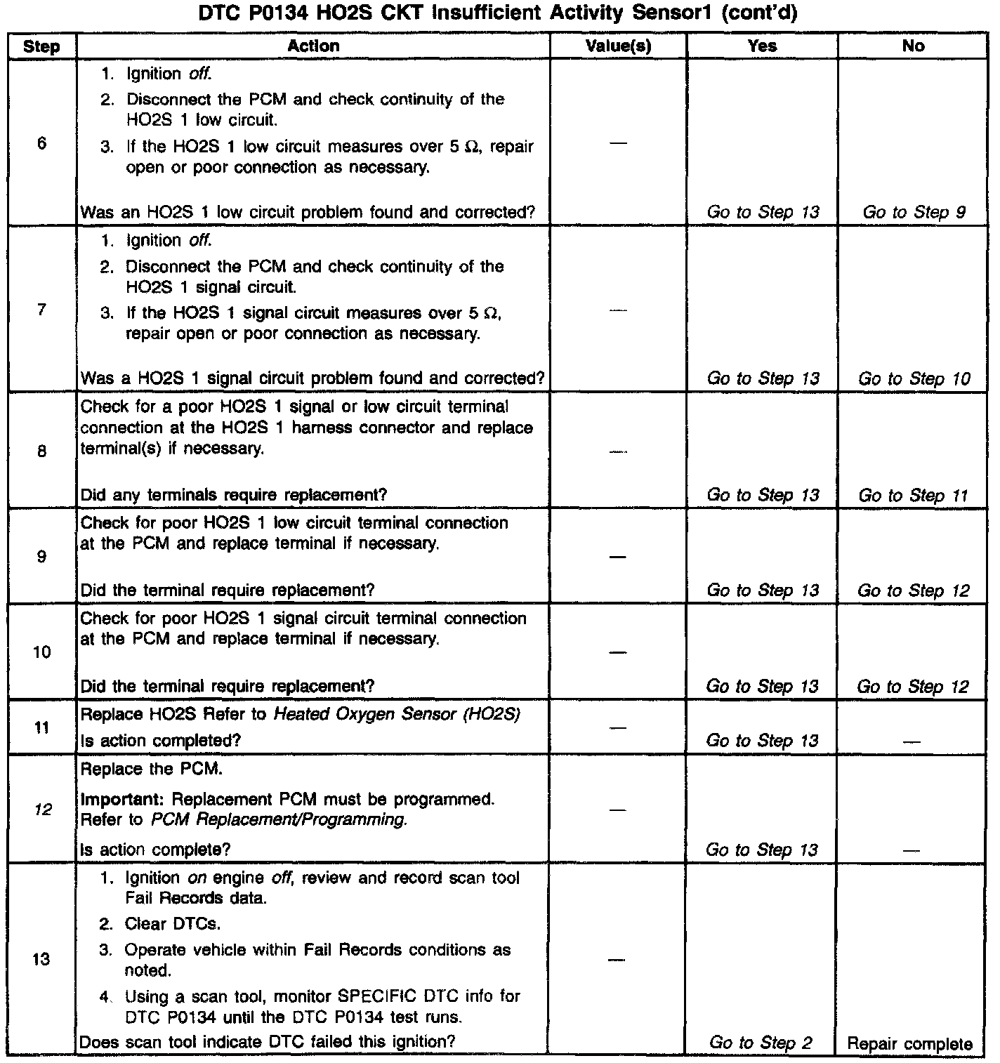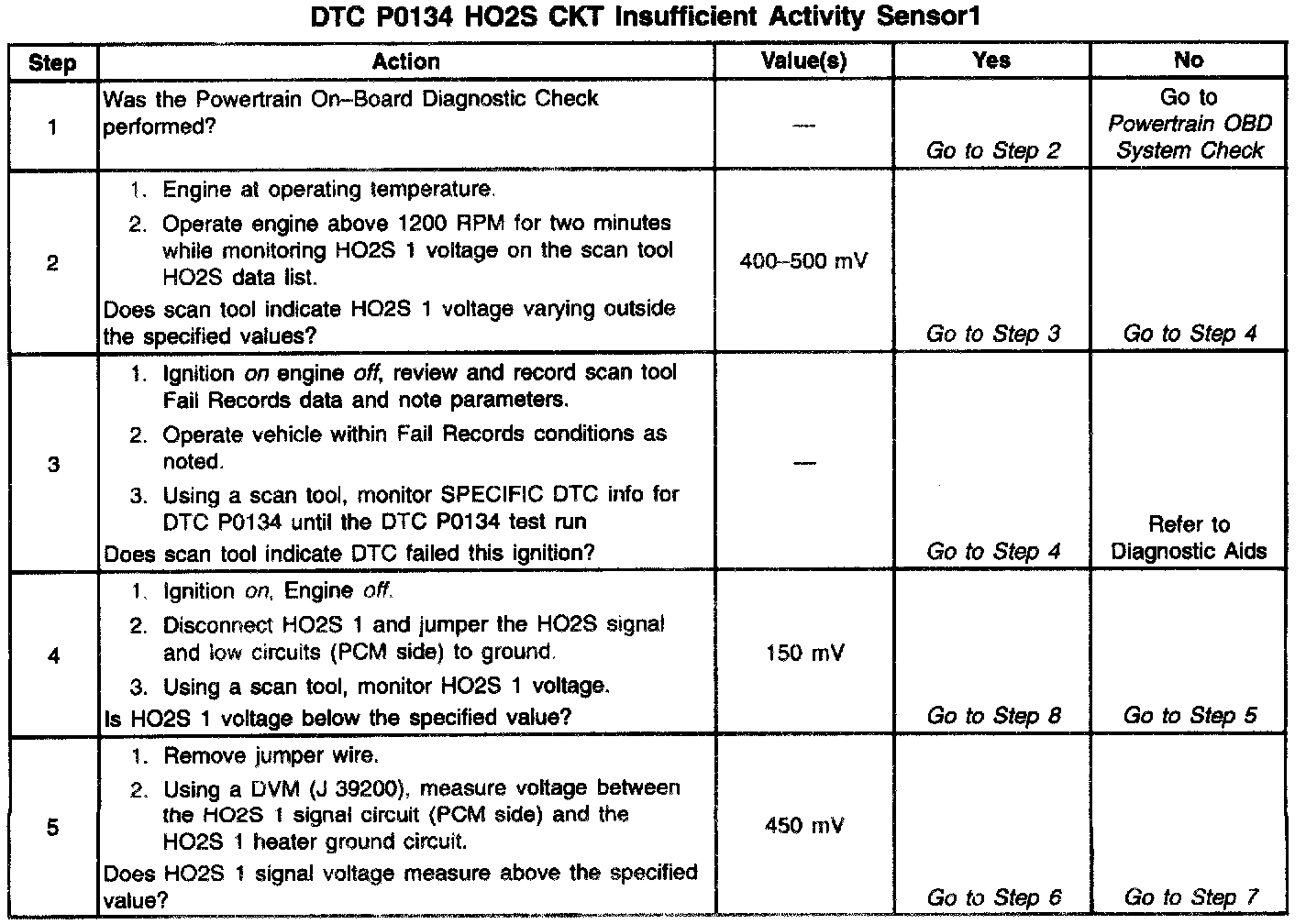 The PCM supplies a bias voltage of about 450 mV between the HO2S signal and low circuits. When measured with a 10 megohm digital voltmeter, this may display as low as 320 mV. The oxygen sensor varies the voltage within a range of about 1000 mV when the exhaust is rich, down through about 10 mV when exhaust is lean. The PCM constantly monitors the HO2S signal during closed loop operation and compensates for a rich or lean condition by decreasing or increasing injector pulse width as necessary. If the HO2S 1 voltage remains at or near the 450 mV bias for an extended period of time DTC P0134 will be set, indicating an open sensor signal or sensor low circuit.