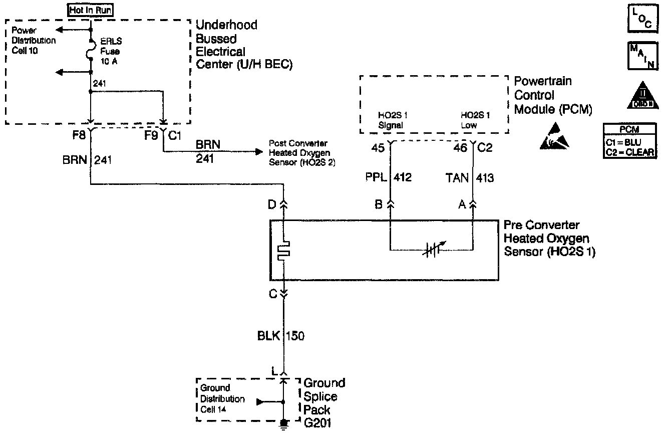 ^ Faulty HO2S heater or heater circuit. With the ignition on, engine off, the HO2S voltage displayed on a scan tool should gradually drop to below 250 mV or rise to above 600 mV. If not, disconnect the HO2S and connect a test light between the HO2S ignition feed and heater ground circuits. If the test light does not light, repair the open ignition feed or sensor ground circuit as necessary. Refer to Repair Procedures in Electrical Diagnosis. If the test light lights and the HO2S signal and low circuits are OK, replace the HO2S.