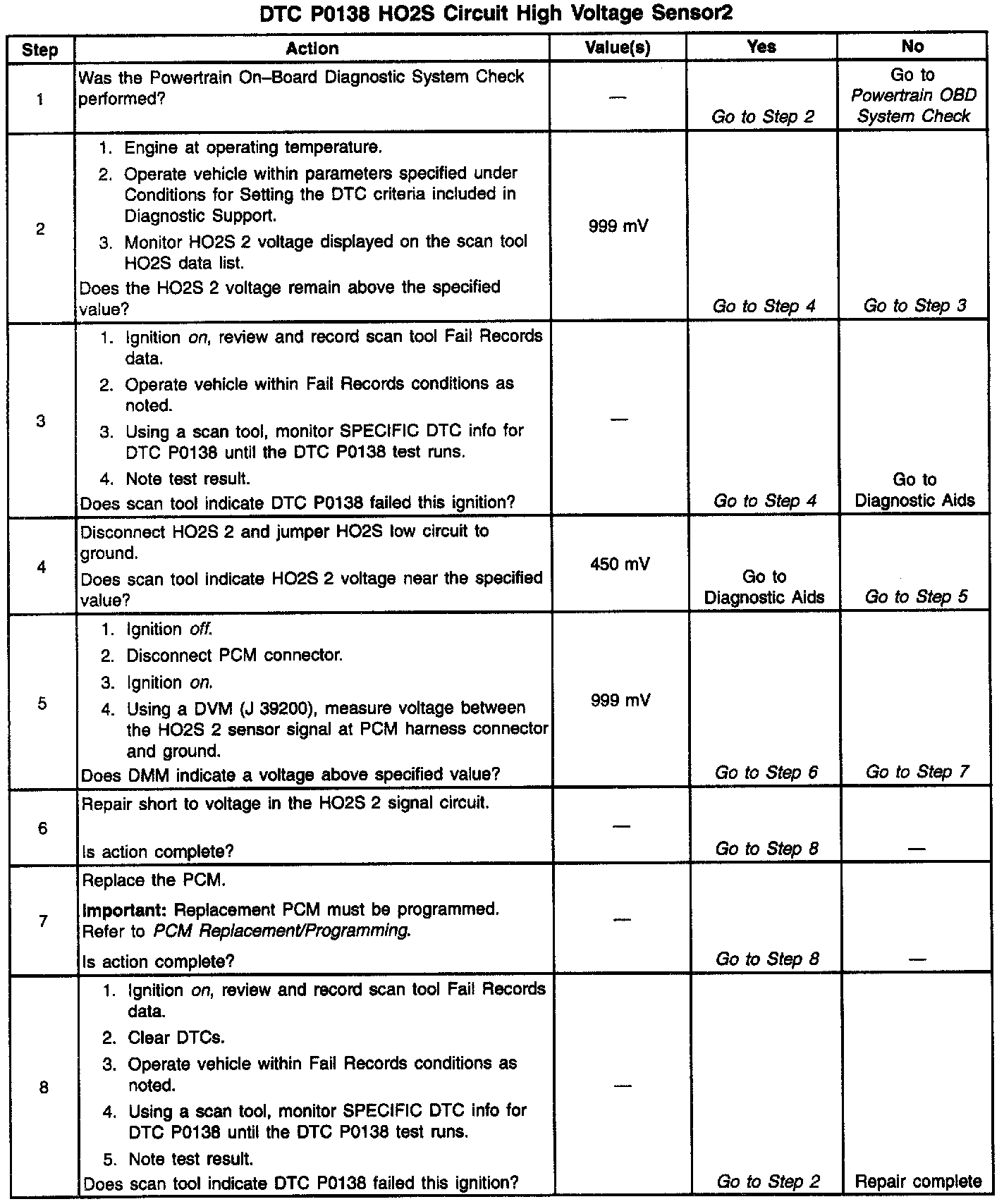 3. DTC P0138 being set during deceleration fuel mode operation may indicate a condition described in the Diagnostic Aids above. If the DTC P0138 test passes while the Fail Records conditions are being duplicated, an intermittent condition is indicated. Reviewing the Fail Records vehicle Mileage since the diagnostic test last failed may help determine how often the condition that caused the DTC to be set occurs. This may assist in diagnosing the condition.