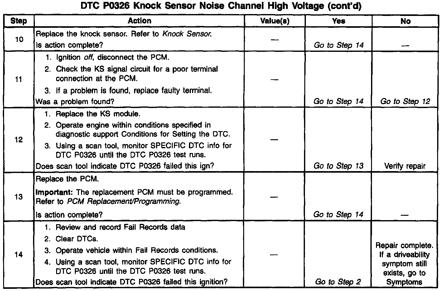 The PCM determines whether knock is occurring by comparing the signal level on the KS circuit with the voltage level on the noise channel. The noise channel allows the PCM to reject any false knock signal by indicating the amount of normal engine mechanical noise present. Normal engine noise varies depending on engine speed and load. When the PCM determines that an abnormally high noise channel voltage level is being experienced. a DTC P0326 will set.
