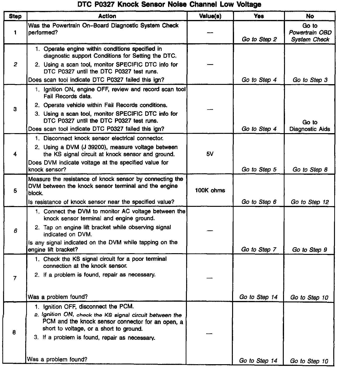 The PCM determines whether knock is occurring by comparing the signal level on the KS circuit with the voltage level on the noise channel. The noise channel allows the PCM to reject any false knock signal by indicating the amount of normal engine mechanical noise present. Normal engine noise varies depending on engine speed and load. When the PCM determines that an abnormally high noise channel voltage level is being experienced, a DTC P0326 will set.