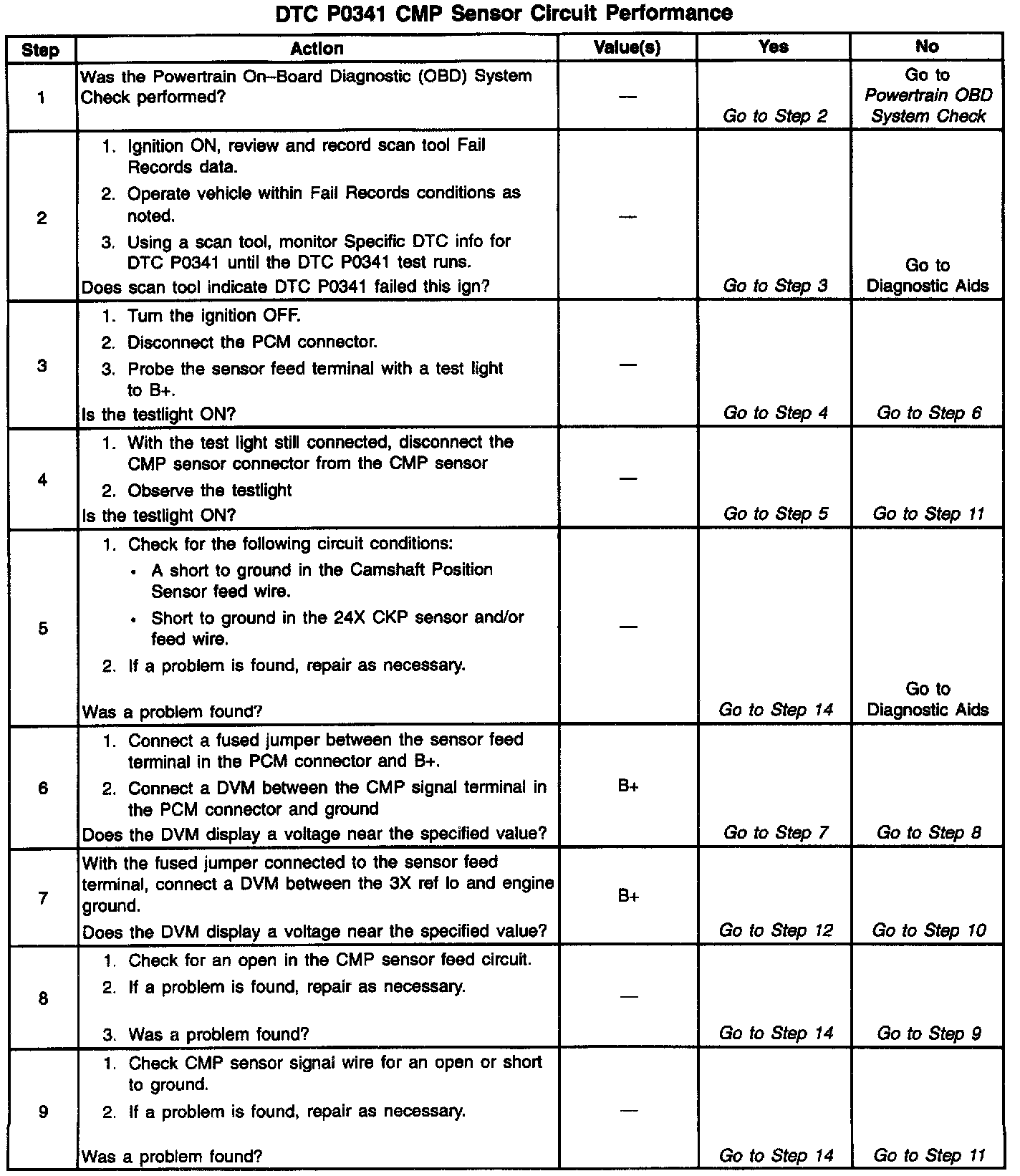 Cam signal pulses to initiate sequential fuel injection. The PCM constantly monitors the number of pulses on the Cam signal circuit and compares the number of Cam pulses to the number of 24X reference pulses and the number of 3X reference pulses being received. If the PCM receives an incorrect number of pulses on the Cam reference circuit, DTC P0341 will set and the PCM will initiate injector sequence without the Cam signal with a one in six chance that injector sequence is correct. The engine will continue to start and run normally, although the misfire diagnostic will be affected if a misfiring condition occurs.