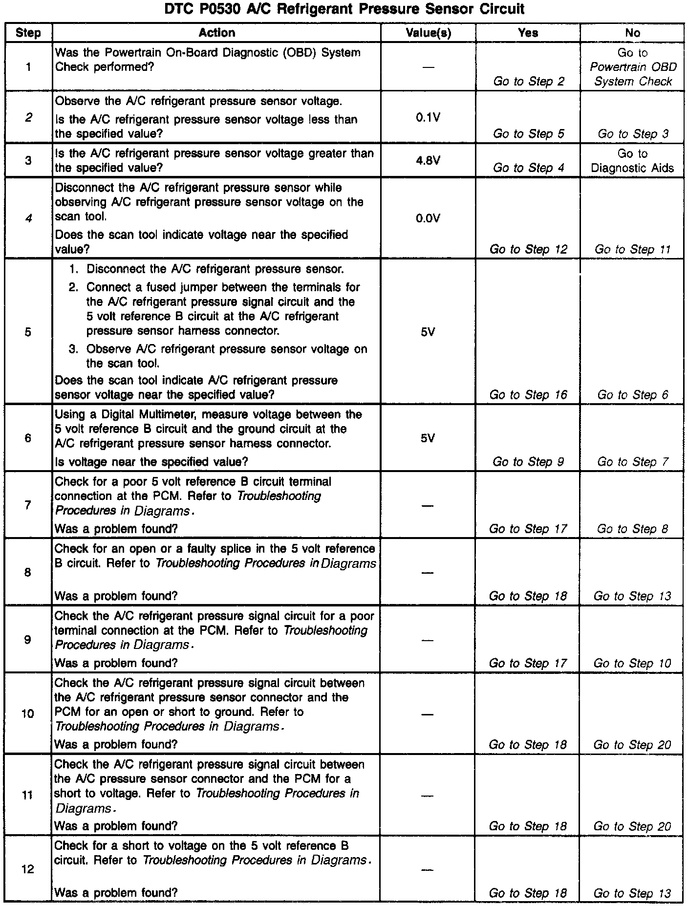 2. Normal A/C pressure sensor signal voltage is between 0.1 and 4.8 volts. If A/C voltage is within range, review Fail Records data to determine the conditions that were present when DTC P0530 set.