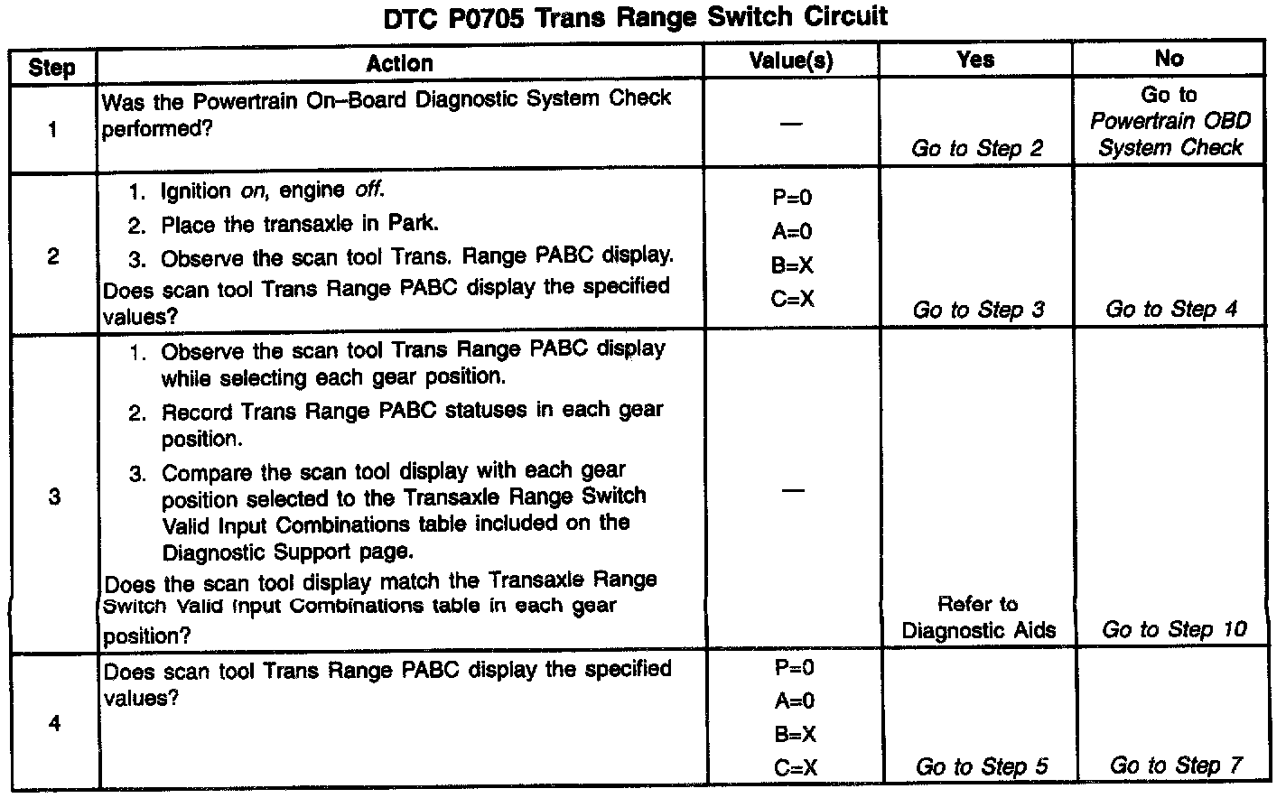 The combination of the four transaxle range input states determine the PCM commanded shift pattern. The input voltage level at the PCM is high (B+) when the transaxle range switch is open and low when the switch is closed to ground. The state of each input is represented on the scan tool as X=high voltage level, 0=low voltage level. The four parameters represent transaxle range switch Parity, A, B, and C inputs respectively.