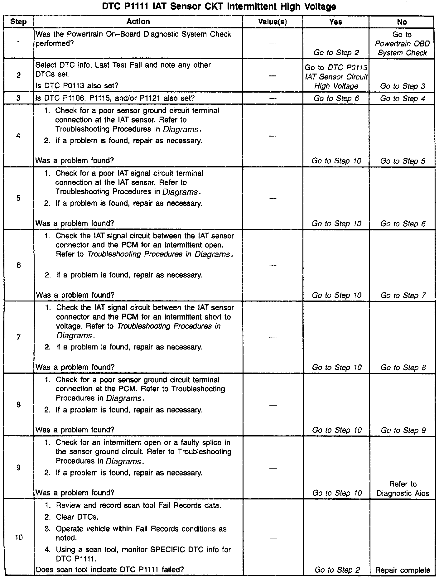 The Intake Air Temperature (IAT) sensor is a thermistor which measures the temperature of the air entering the engine. The PCM applies 5 volts through a pull-up resistor to the IAT sensor. When the intake air is cold, the sensor resistance is high and the PCM will monitor a high signal voltage on the IAT signal circuit. If the intake air is warm, the sensor resistance is lower causing the PCM to monitor a lower voltage. DTC P1111 will set when the PCM detects an intermittently high signal voltage on the intake air temperature sensor signal circuit.